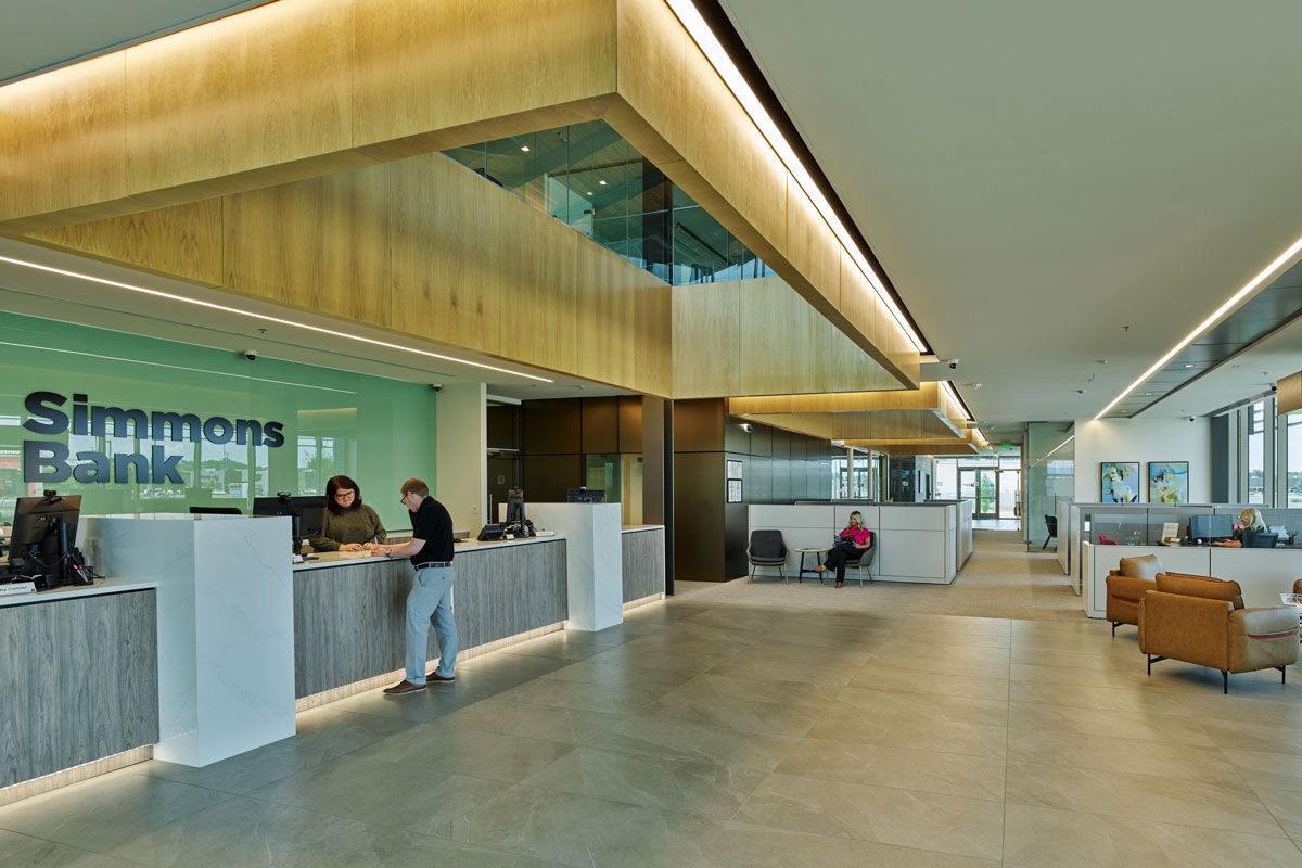 Flynco constructed this 20,000-square-foot, two-story Simmons Bank facility in Jonesboro — a strikingly modern structure that has been nominated for an AIA design award. The building features an exposed steel frame with warm wood tongue-and-groove decking and expansive glass curtain walls on three sides, creating a transparent and welcoming presence. At night, the exterior comes alive with LED fin lights and a prominent illuminated tower that can display vibrant light shows in celebration of holidays and community events. Designed to serve as both a functional banking facility and an architectural landmark, the project reflects Simmons Bank’s commitment to innovation, openness, and community connection.