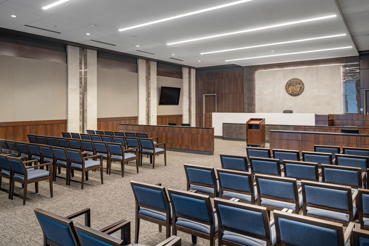 A key highlight of the project is its focus on efficiency and sustainability. Innovative mechanical, electrical, and plumbing (MEP) systems are projected to achieve a 10-year payback, saving the city approximately $150,000 annually in energy costs. Additionally, bipolar ionization systems and improved HVAC filtration promote healthier indoor air quality, while programmable LED lights surrounding the roof offer an eye-catching feature that can be illuminated in various colors. Together, these elements ensure the North Little Rock Justice Center stands as a forward-thinking and community-oriented complex for years to come.