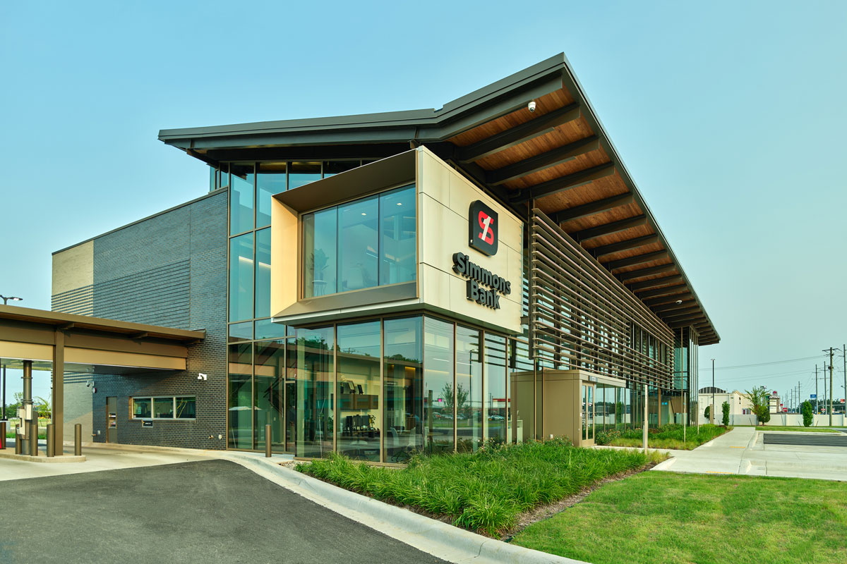 Flynco constructed this 20,000-square-foot, two-story Simmons Bank facility in Jonesboro — a strikingly modern structure that has been nominated for an AIA design award. The building features an exposed steel frame with warm wood tongue-and-groove decking and expansive glass curtain walls on three sides, creating a transparent and welcoming presence. At night, the exterior comes alive with LED fin lights and a prominent illuminated tower that can display vibrant light shows in celebration of holidays and community events. Designed to serve as both a functional banking facility and an architectural landmark, the project reflects Simmons Bank’s commitment to innovation, openness, and community connection.