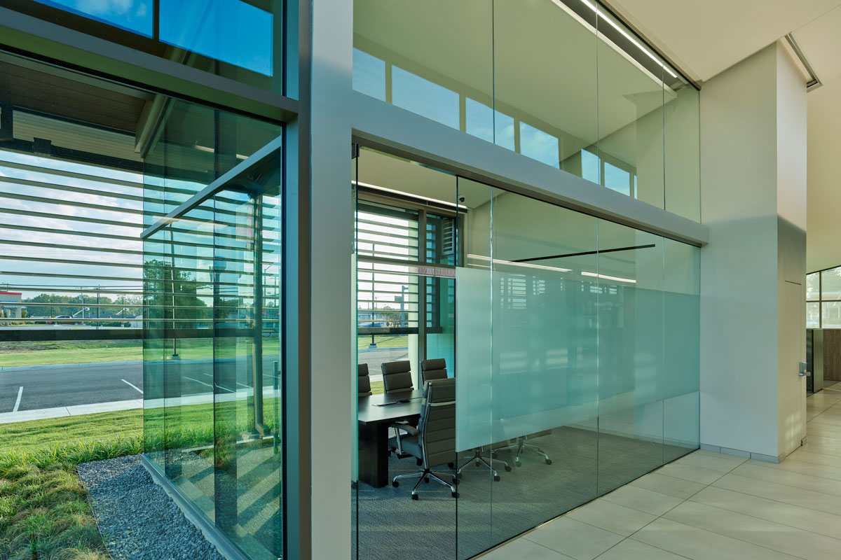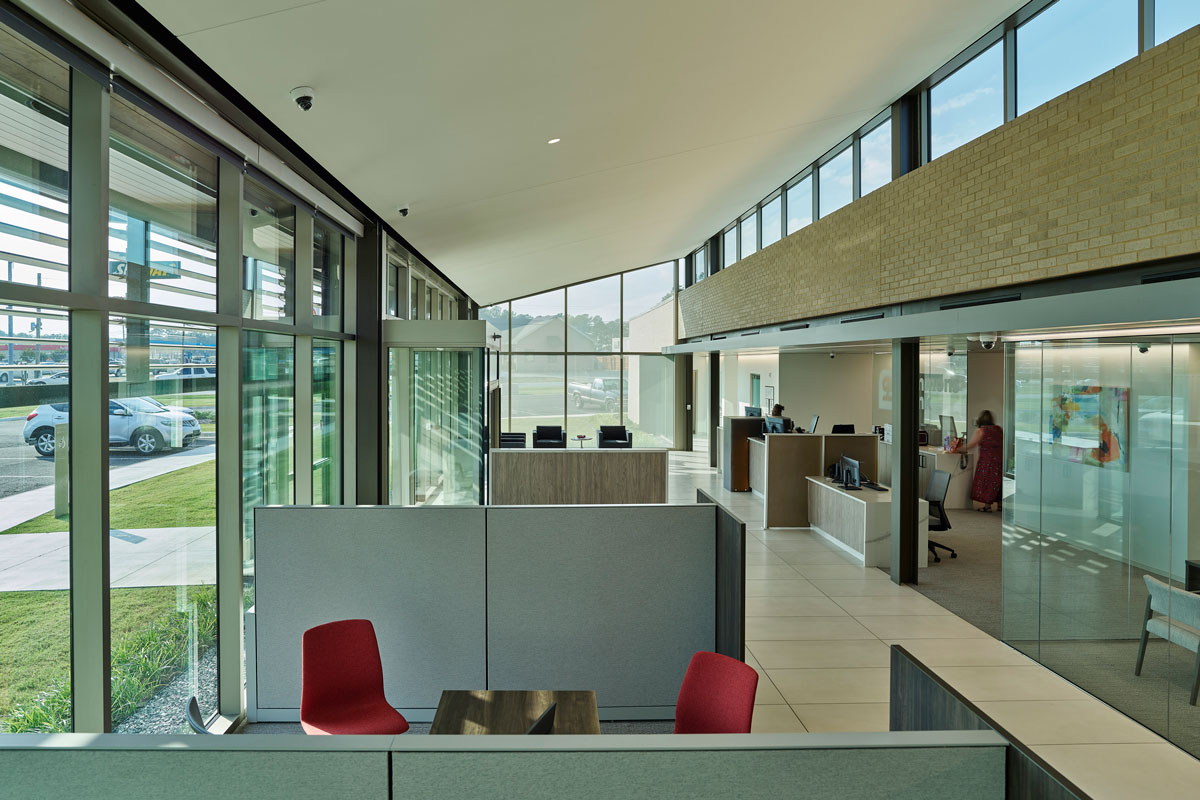 Flynco’s construction of the 4,700-square-foot Simmons Bank branch in White Hall seamlessly marries eye-catching architecture with practical design. The building is enveloped by curtainwall glass on three sides, allowing ample natural light to flow into its interior—where five offices and a conference room facilitate a welcoming and productive environment for both clients and staff. Clerestory windows further amplify daylight while maintaining privacy in key areas, reflecting a thoughtful balance of openness and discretion.