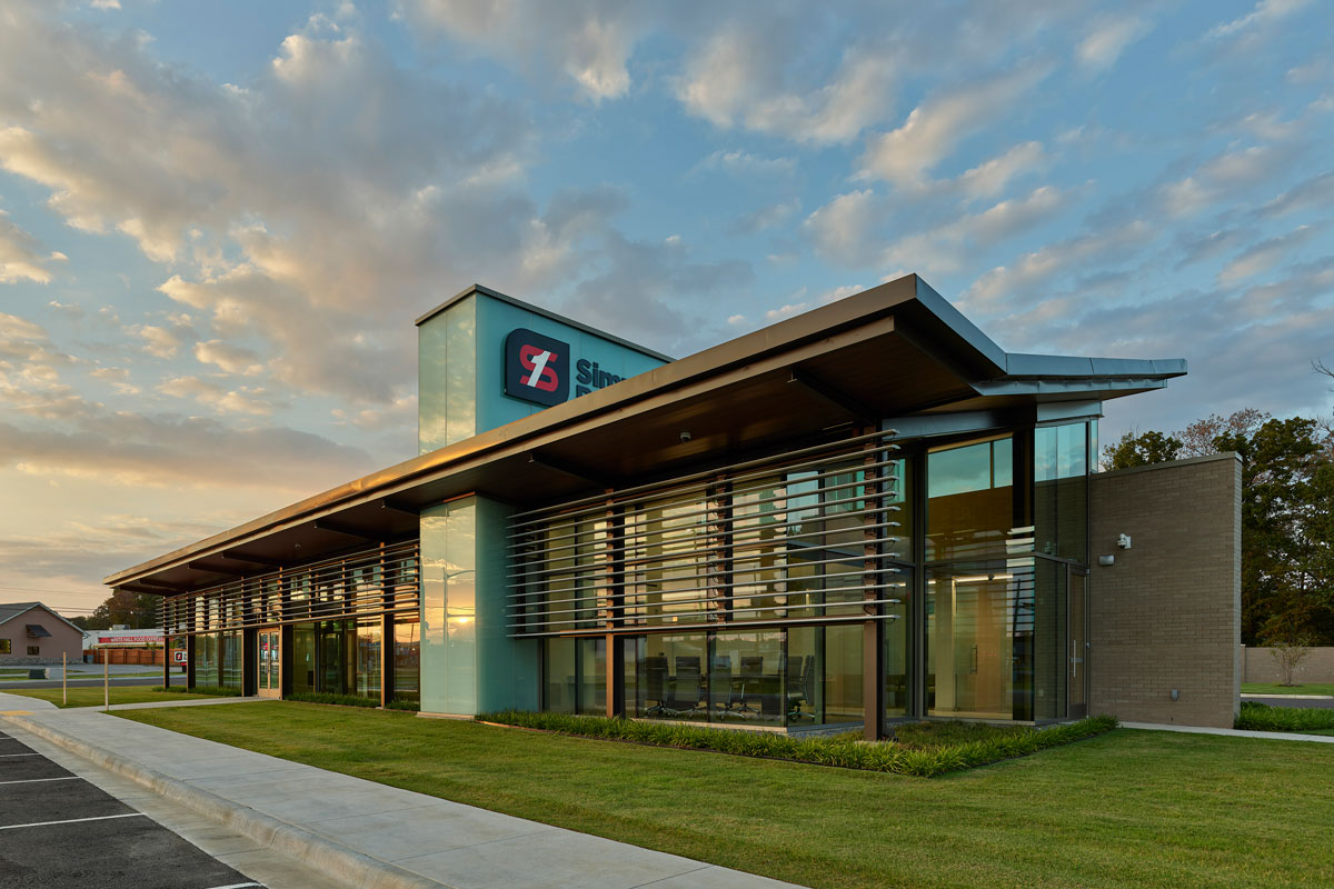A notable exterior highlight is the lighted glass tower, which features color-changing illumination that elegantly ties into the bank’s branding and adds a dynamic visual element to the local skyline. This tower is complemented by airfoil sunshades integrated with lighting along the building’s façade, creating synchronized “light shows” that reinforce the branch’s modern aesthetic. Together, these striking design choices, along with Flynco’s hallmark craftsmanship, ensure that Simmons Bank’s White Hall branch stands out as a distinctive community asset.